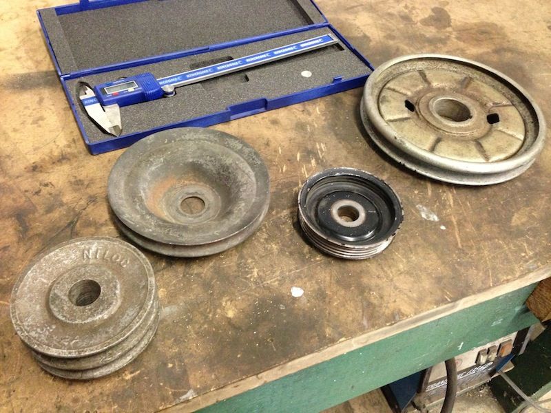Selection of pulleys - from left to right - random pulley that came in a box of junk with my mill, VW A/C pulley, AMR 500 pulley, Stock VW crank pulley
