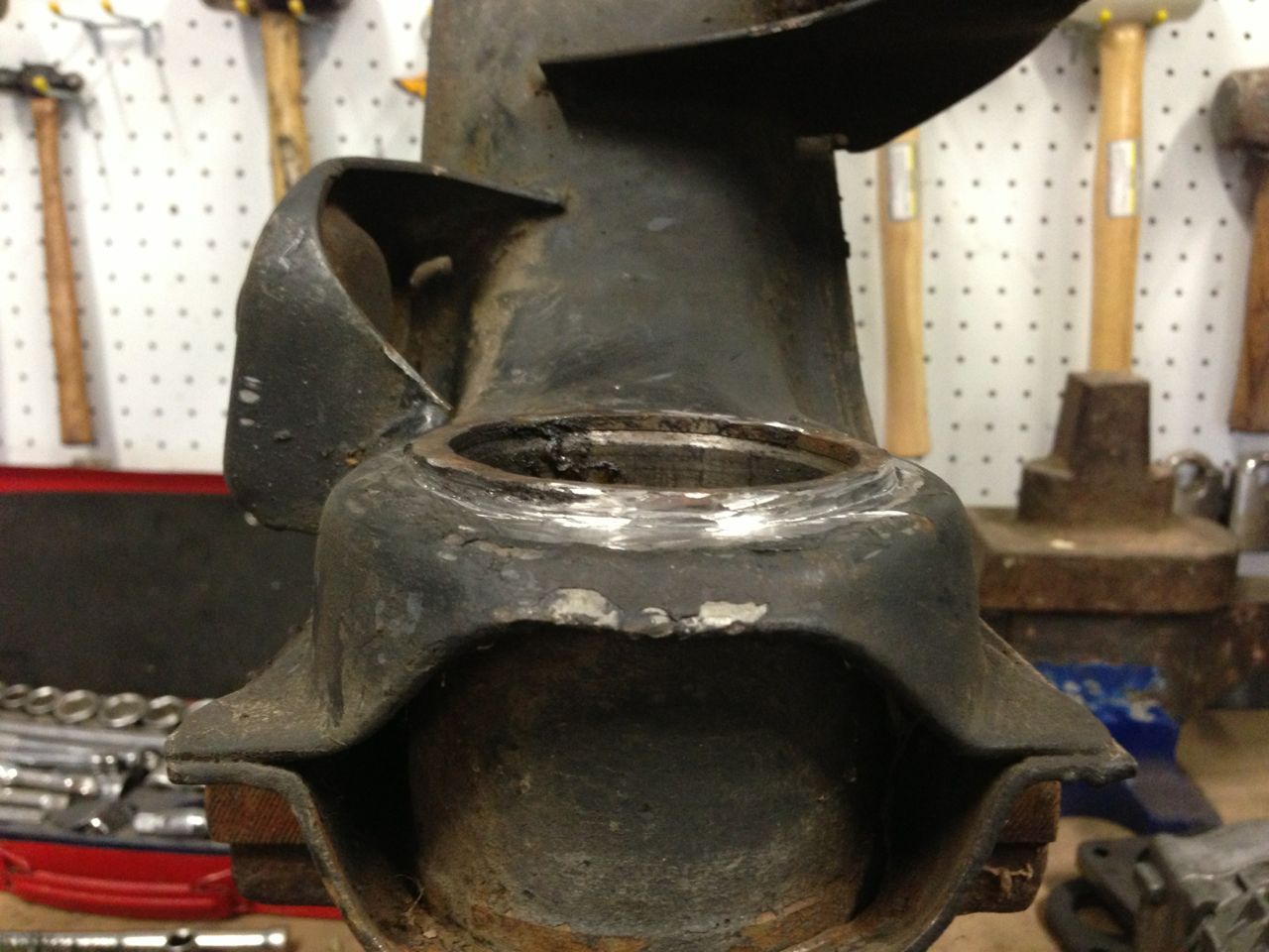 I should only need to face off about 2mm from the inside of the boss in the lathe to get an easy 10mm narrower arm. Basically the part in line with the 10mm mark will be pushed in to sit where the 0mm mark is and then re welded. I cold go for a bit more but don't want to make the boss too thin. Most people simply hack the arm up so that it clears the boss and re-weld the boss back in where necessary. I want to try and retain the original material in the arm and clearance the boss to suit. Obviously I cannot go as narrow this way but in my case 10-15mm would be perfect, and all I need to get the extra clearance with the rear guards. It also means that I can retain the stock drive shafts as the CV's have much more travel than this.