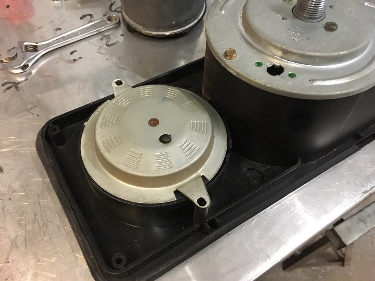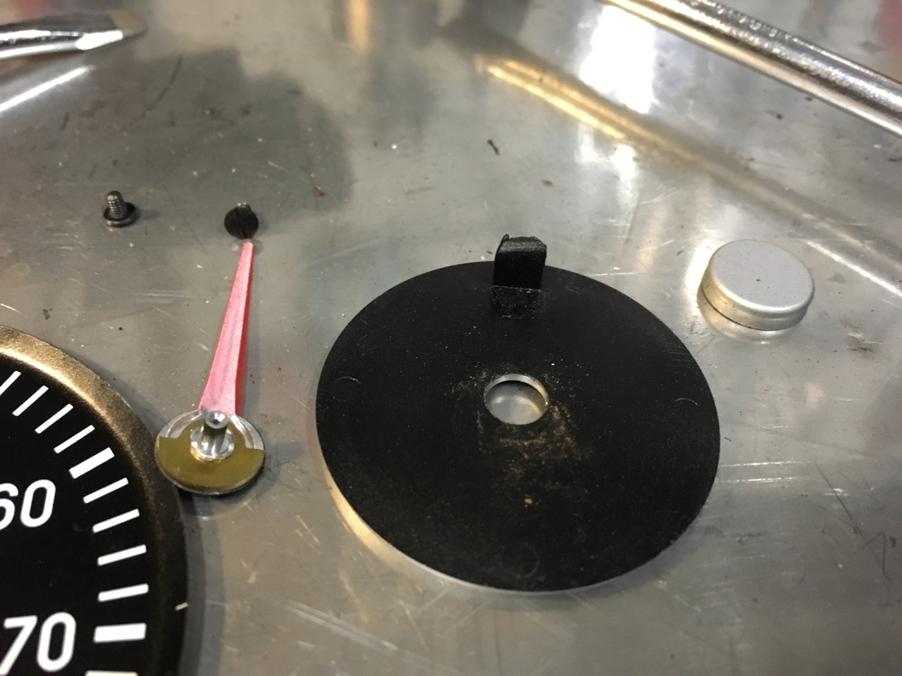 DIY Tacho made from 80mm VDO tacho and original blanking plate from dash. The blanking plate has the centre cut out so that it can be used to hold tach in place. The trim ring and button are reused on the tacho face. The dial is just laser...