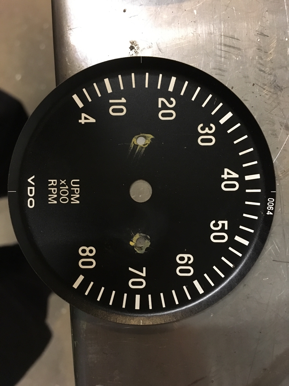 DIY Tacho made from 80mm VDO tacho and original blanking plate from dash. The blanking plate has the centre cut out so that it can be used to hold tach in place. The trim ring and button are reused on the tacho face. The dial is just laser printed onto card stock. I scanned the original tacho face and then drew another one the correct style.